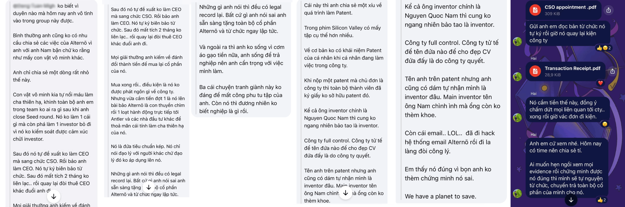Cũng trong ngày hôm đó, Hải đã chia sẻ những lời lẽ xúc phạm tôi với một nhóm bạn bè và cựu thành viên Antler (khoảng hơn 20 người). Bao gồm cả việc phát tán các tài liệu mật vốn không bao giờ được phép chia sẻ bên ngoài hội đồng quản trị và cố vấn pháp lý.