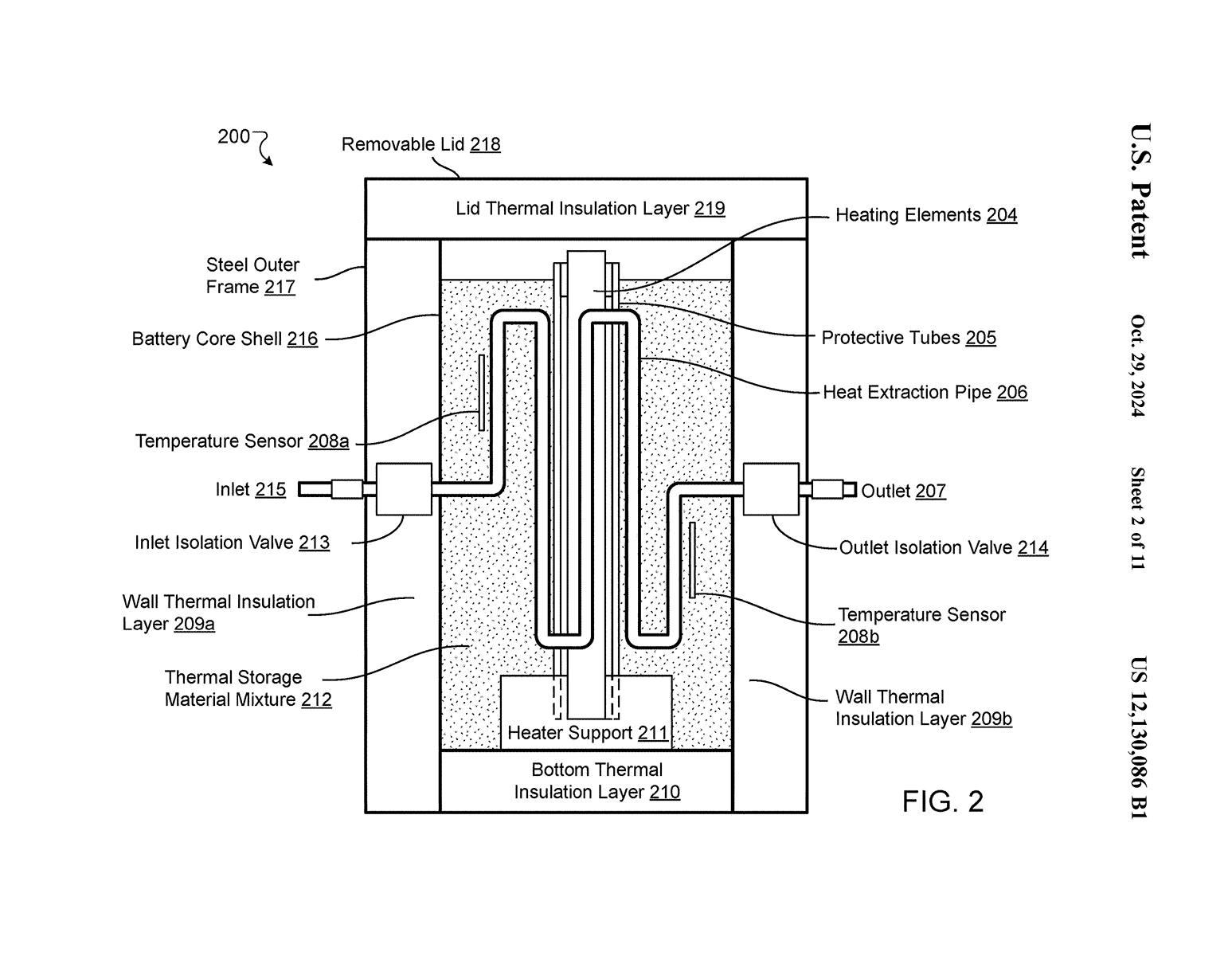 Another key innovation in our Sand Battery design is the strategic distribution of heating elements throughout the thermal storage material. Rather than using a single, large heating element, our patent describes a plurality of heating elements (204) placed throughout the battery core, each surrounded by a protective tube (205).These protective tubes are made from a specialized carbon-based mixture of silicon carbide and graphite, materials chosen for their exceptional heat conductivity and structural integrity at high temperatures. This design serves multiple critical functions: